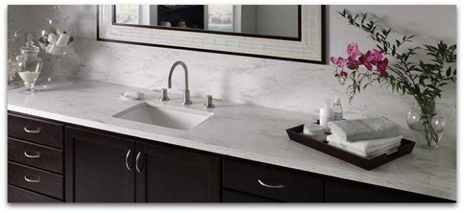 but no single product comes as close as solid surface made by DuPont™ Corian®, or competitor brands such as LG HI-MACS®, Aristech™ Avonite®, LOTTE Advanced Materials Staron®, Formica® Solid Surface, Wilsonart®Solid Surface, Hanwha™ Hanex®, Mystera® or Meganite®. Here are eight key things you might consider when ordering a Corian custom vanity top that will reside on your vanity cabinet:1. Color and Size
